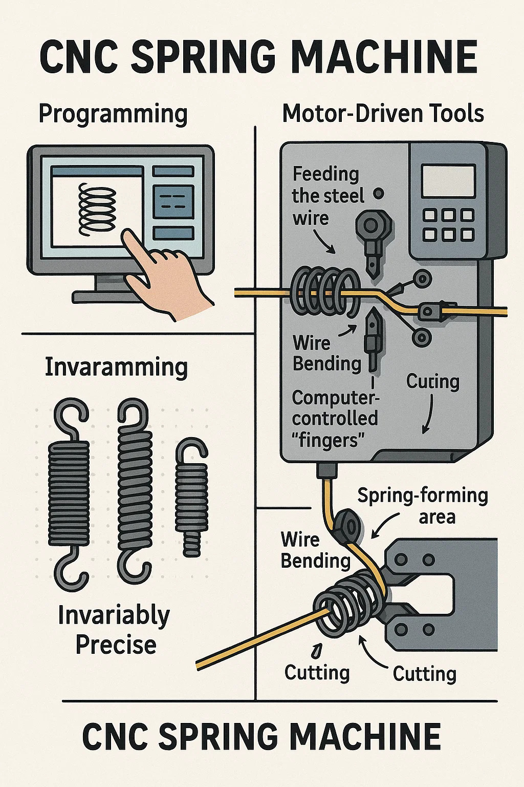 "CNC 스프링"이란 컴퓨터로 제어되는 스프링 기계를 사용하여 스프링을 제조하는 것을 의미합니다. 이는 컴퓨터 프로그래밍을 사용하여 명령을 내리고 여러 개의 독립 모터에 지시하여 굽힘 도구와 절단기를 구동하고 강철 와이어 롤을 정확하고 빠르고 유연하게 굽히고 절단하여 설계한 스프링을 얻습니다. 이 방법은 빠르고 정확하며 복잡한 형상을 제작할 수 있다는 점에서 현대 스프링 생산의 핵심입니다.