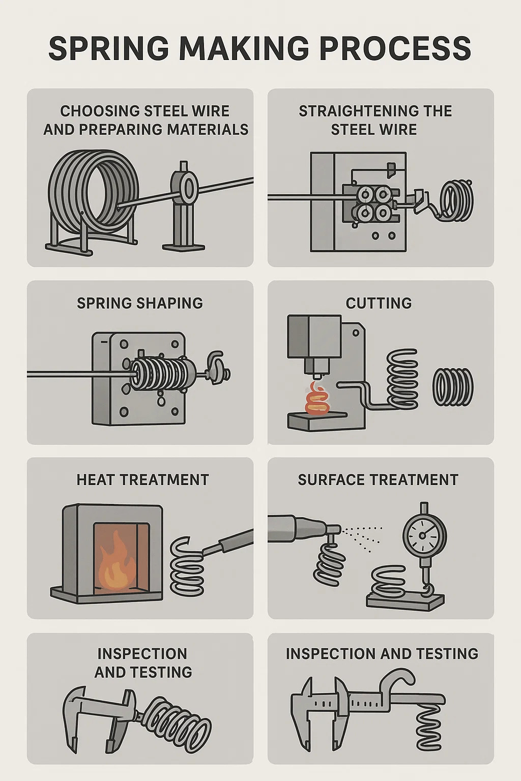 • 가열: 스프링을 용광로에 넣고 특정 고온으로 가열합니다(약간 붉은색으로 나타남).