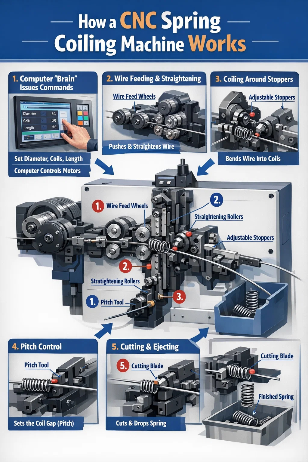 일반 스프링 코일링 기계가 톱을 사용하는 장인과 같다면, CNC 스프링 코일링 기계는 정확한 탐색과 자동화된 팔을 갖춘 현대 가공 공장과 같습니다. 크기 조정을 위해 복잡한 기계 기어가 필요하지 않습니다. 화면에 손가락을 대고 몇 가지 명령을 입력하기만 하면 기계가 신속하게 동일한 스프링을 생성합니다.