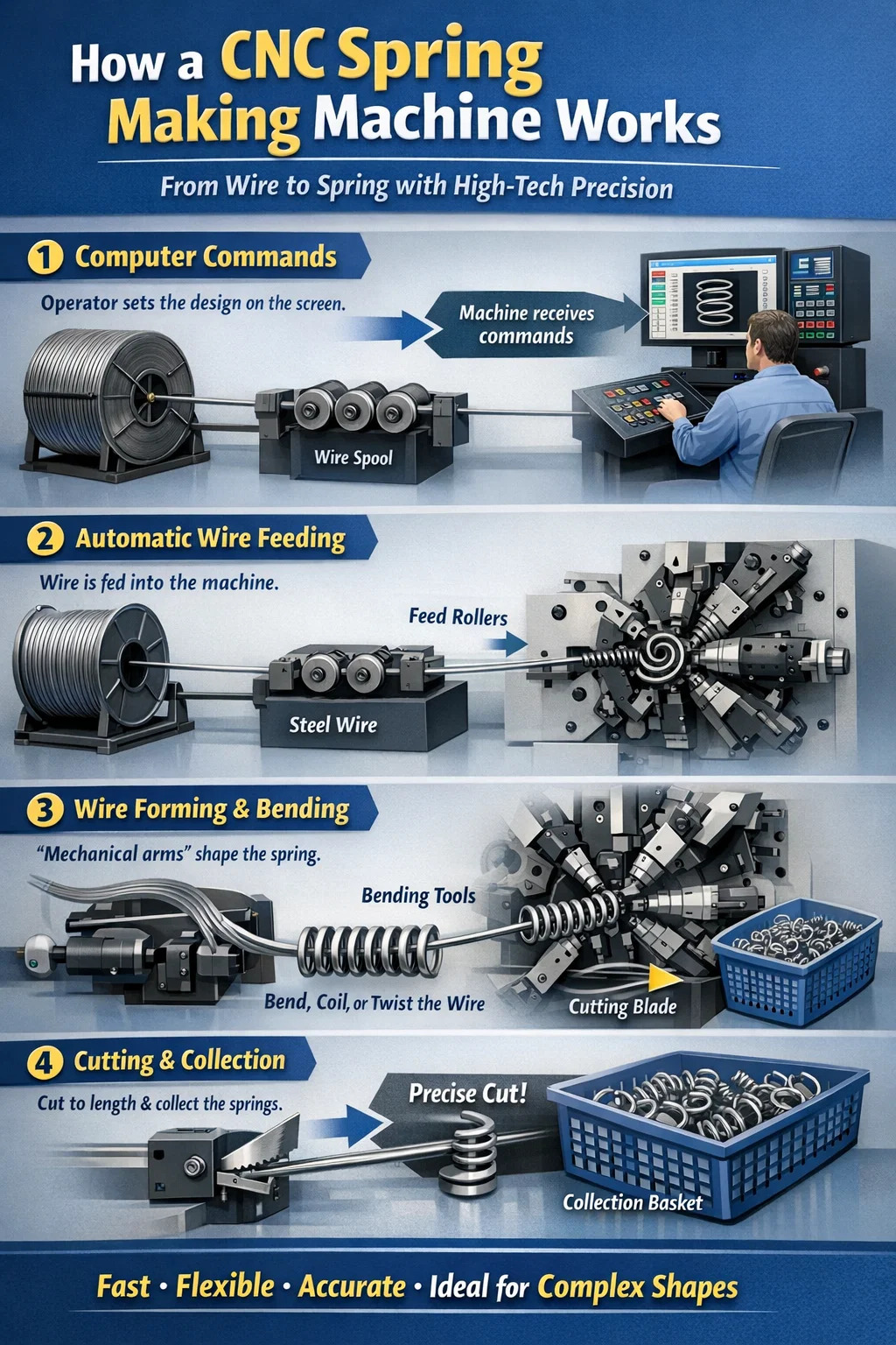 • 간단히 말해서, CNC 스프링 제조 기계는 컴퓨터로 제어되는 자동화된 기계로, 스프링 및 다양한 와이어 제품을 생산하도록 특별히 설계되었습니다.
