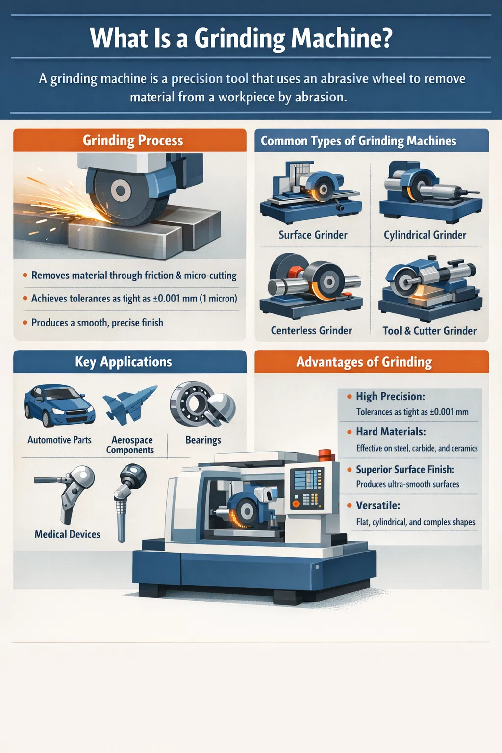 에이 연삭기 연마 휠 또는 기타 연마 절단 도구를 사용하여 마모를 통해 공작물에서 재료를 제거하는 정밀 전동 공구 또는 산업용 기계입니다. 그 결과 표면이 미세하게 마감되고, 치수가 정확하며, 모서리가 예리해집니다. 제조에서 연삭기는 공작 기계의 하위 유형으로 분류되며 공차가 엄격한 마무리 작업에서 중요한 역할을 합니다. ±0.001mm(1미크론) 필수입니다.