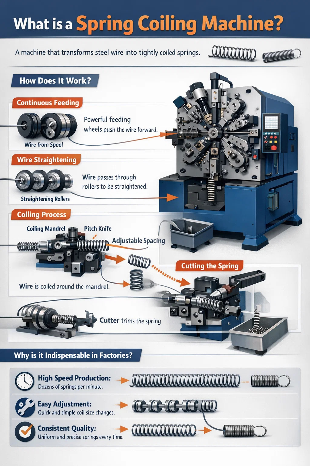 금속 와이어를 깔끔한 스프링으로 변환하기 위해 기계는 내부적으로 "밀기 및 차단"이라는 정밀한 조정을 수행합니다.