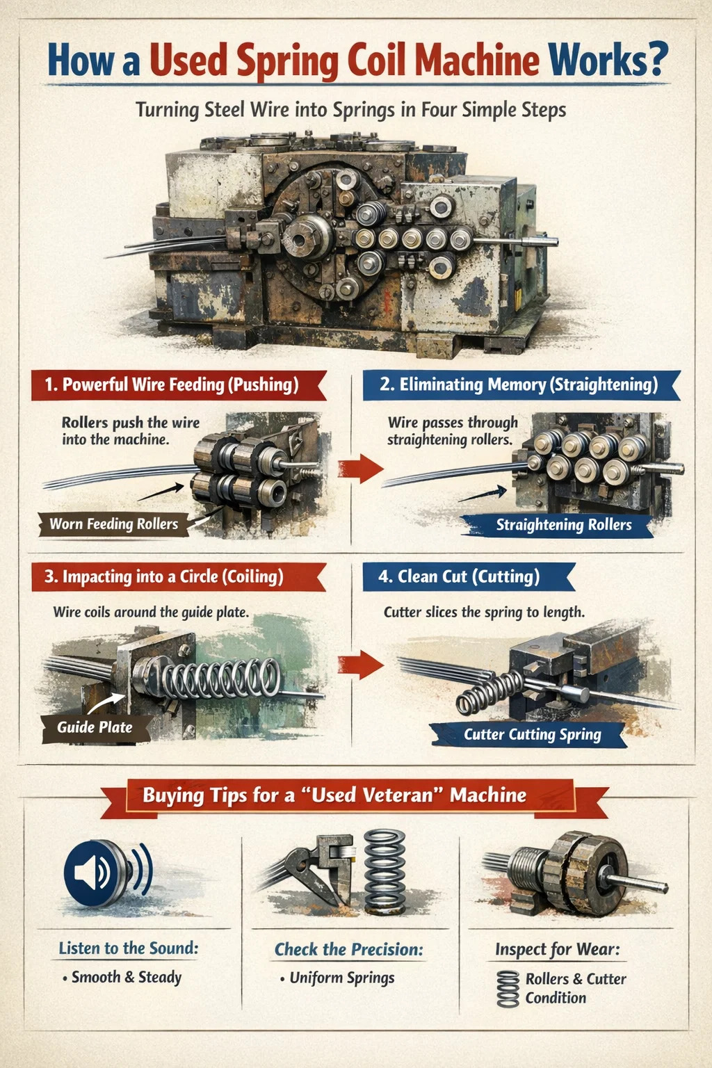 에이lthough it's second-hand, its essence remains unchanged: it's still a powerful tool specifically designed to coil straight metal wire into spiral springs. Many factories choose this highly cost-effective equipment to save costs because of its robust structure; with proper maintenance, it still performs efficiently and reliably.