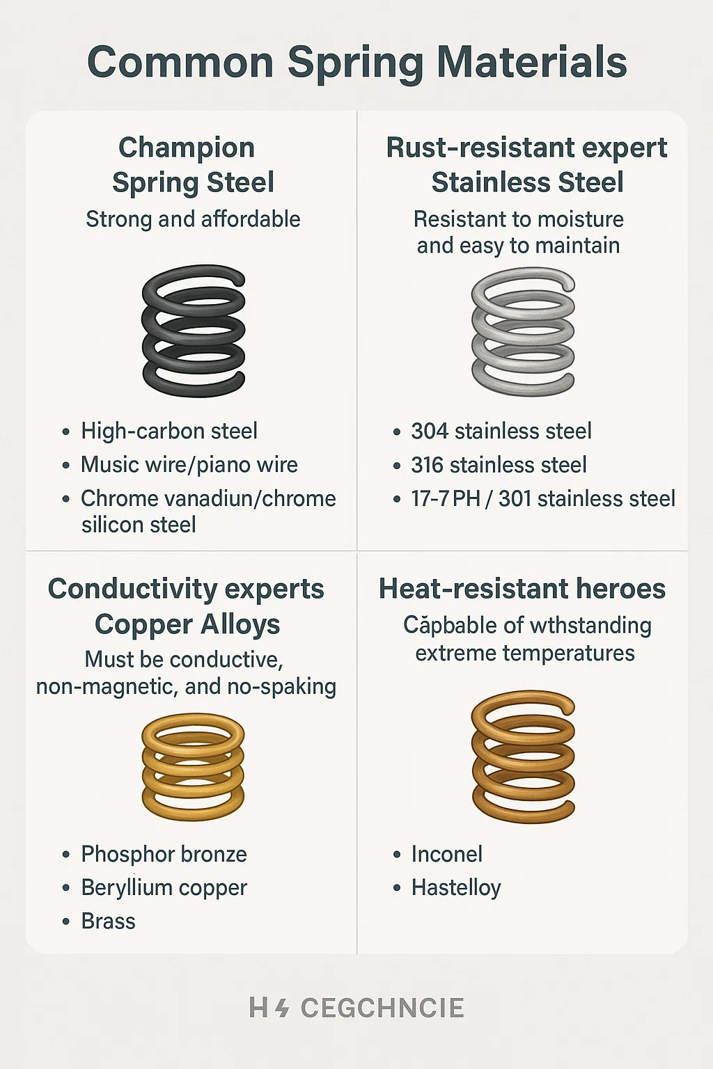 스프링에 적합한 금속을 선택하는 것은 응용 분야 요구 사항에 따라 달라집니다. 얼마나 많은 힘을 견딜 수 있습니까? 녹슬까요? 작업환경이 더울까요? 전기를 전도해야합니까? 일반적으로 사용되는 재료의 특성은 다음과 같습니다.